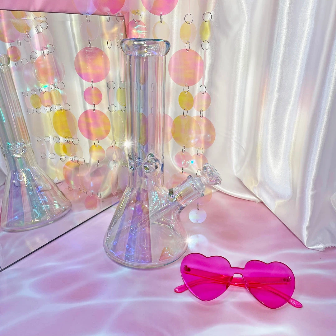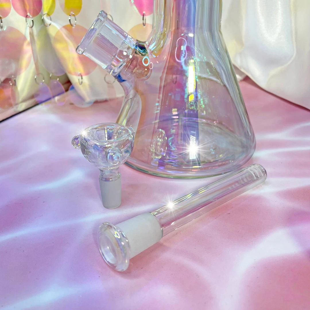 This bong is a stunner! I wish you could see her IRL. She’s completely covered in iridescence- the slide and downstem are iridescent too!