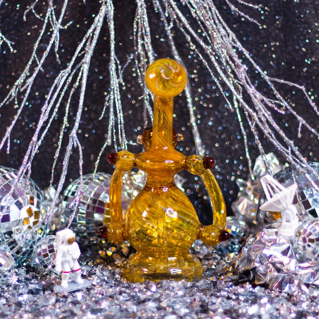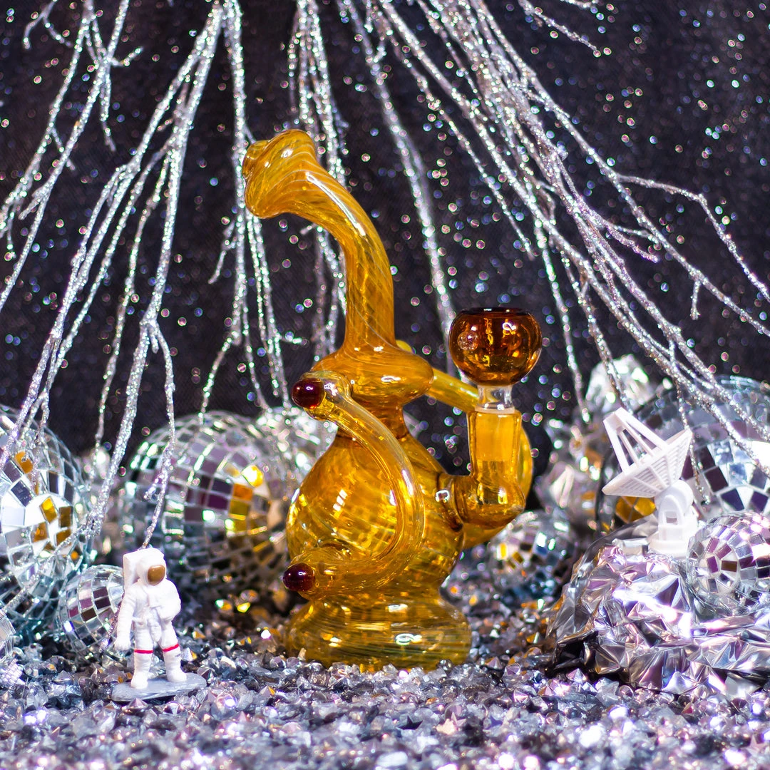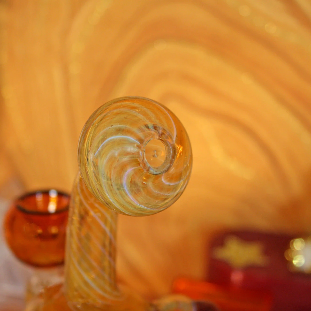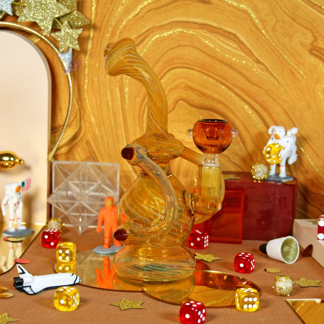 This recycler measures 8.5″ tall and is made of swirled amber glass.