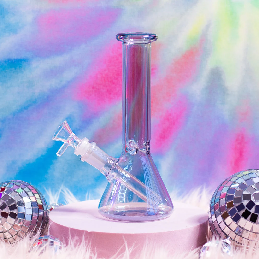 We love this bong! Made of clear glass completely covered in a gorgeous iridescent sheen so it shines from every angle.