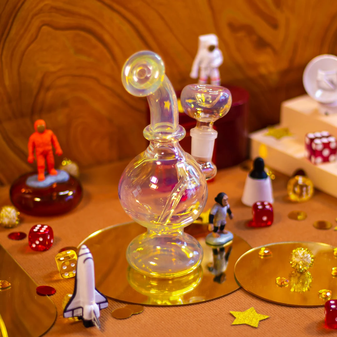 This piece is made of gorgeous gorgeous gold fumed glass. The slide matches the piece and even has an ash catcher. This piece is in a fun globe shape with a curved neck.