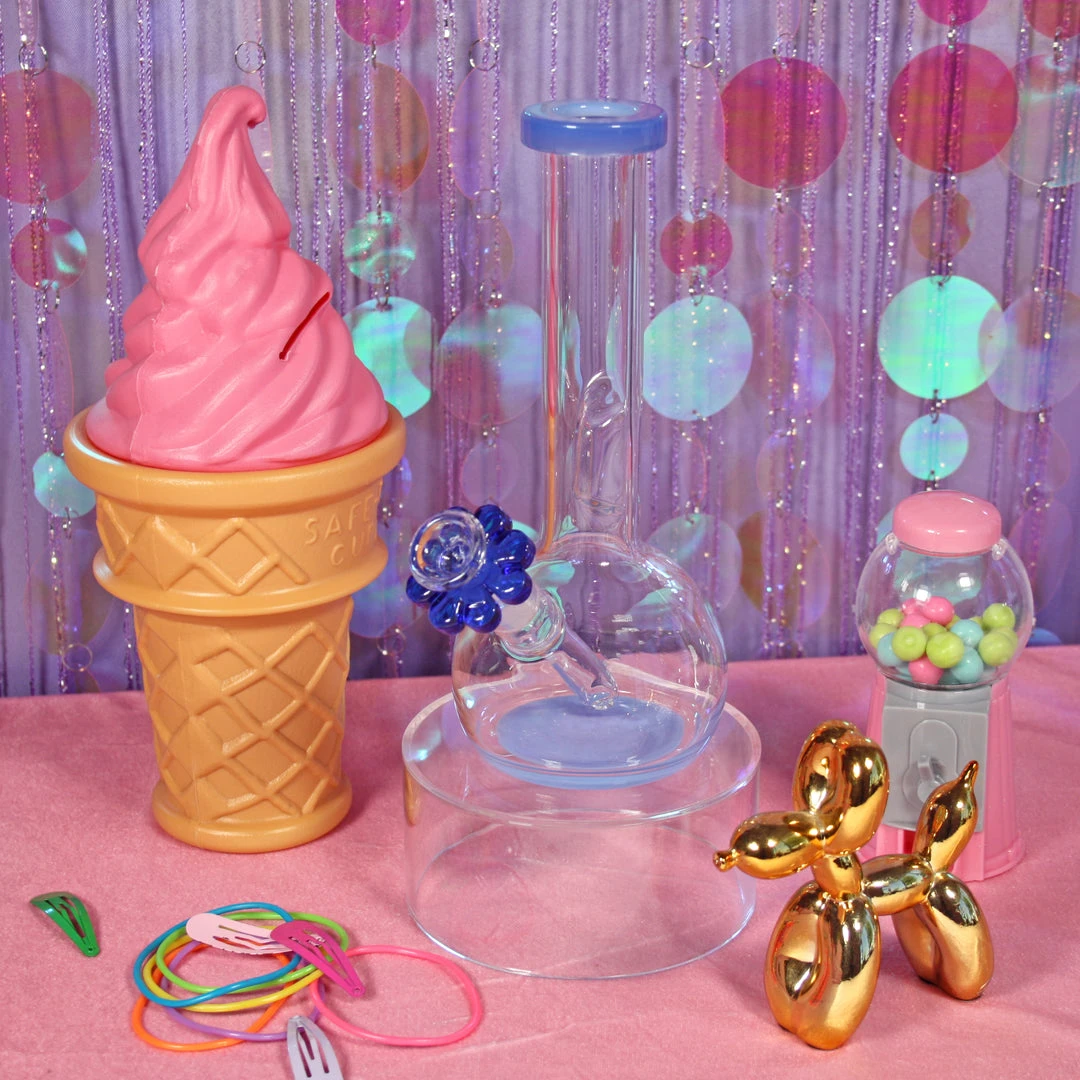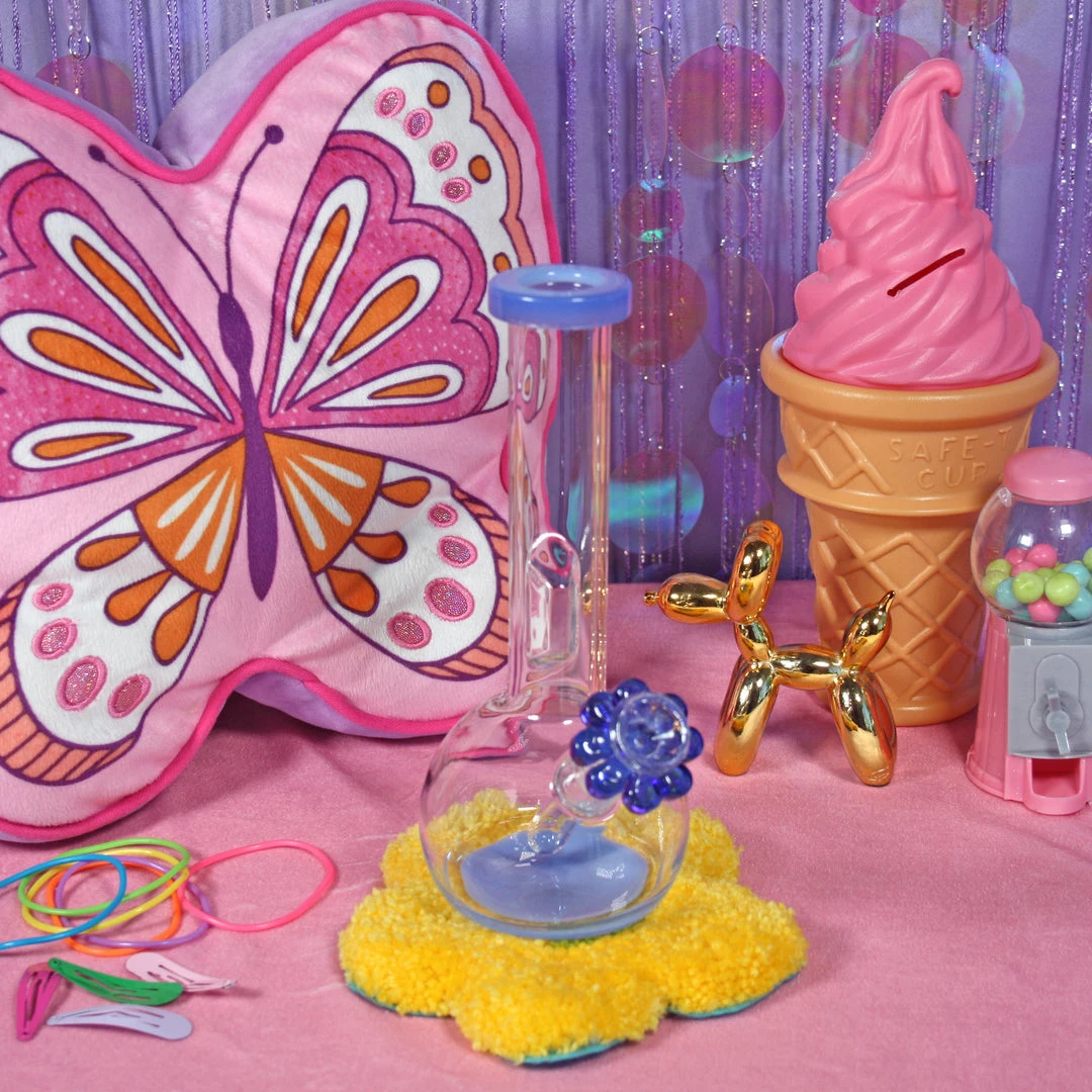 This piece is 8.5″ tall. A beaker shape makes it extra stable on any surface. Neck is long and even includes an ice catcher that doubles as a grip! Touches of jade blue glass are on the top and bottom of this piece. We love the blue on the bottom! Even comes with a matching blue daisy slide <3