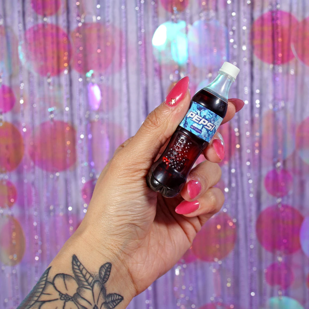 To ignite, first FILL YOUR LIGHTER WITH BUTANE (more on that below!) Next, with the soda pop flipped upside down, flick the bottom of the bottle in the direction of the downward diagonal seam.