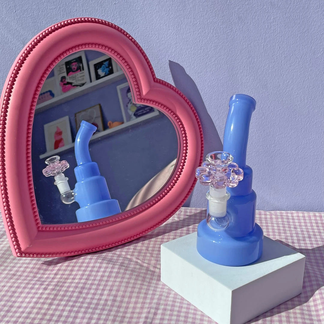 Made of cornflower colored milky glass, this piece is on the smaller side measuring 7″ tall. A conical base keeps this piece steady on any surface. The best part is it comes with a pink flower bowl that gives it that extra special touch <3