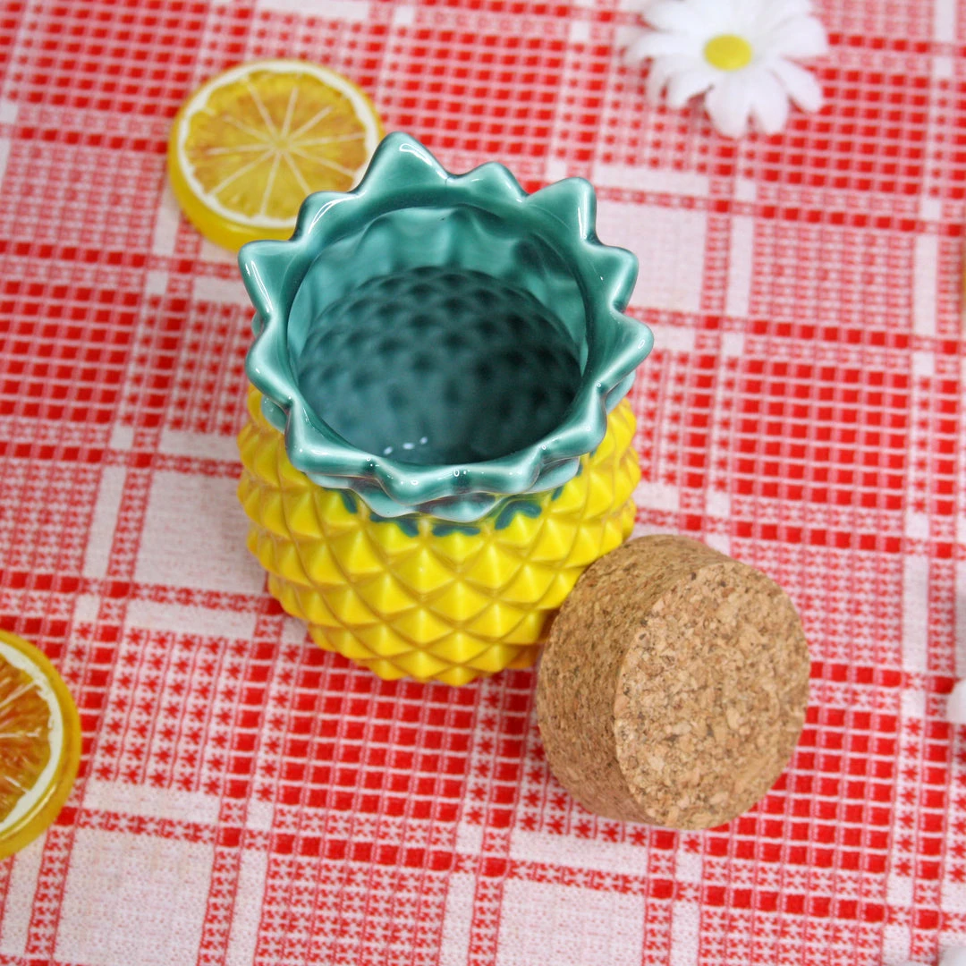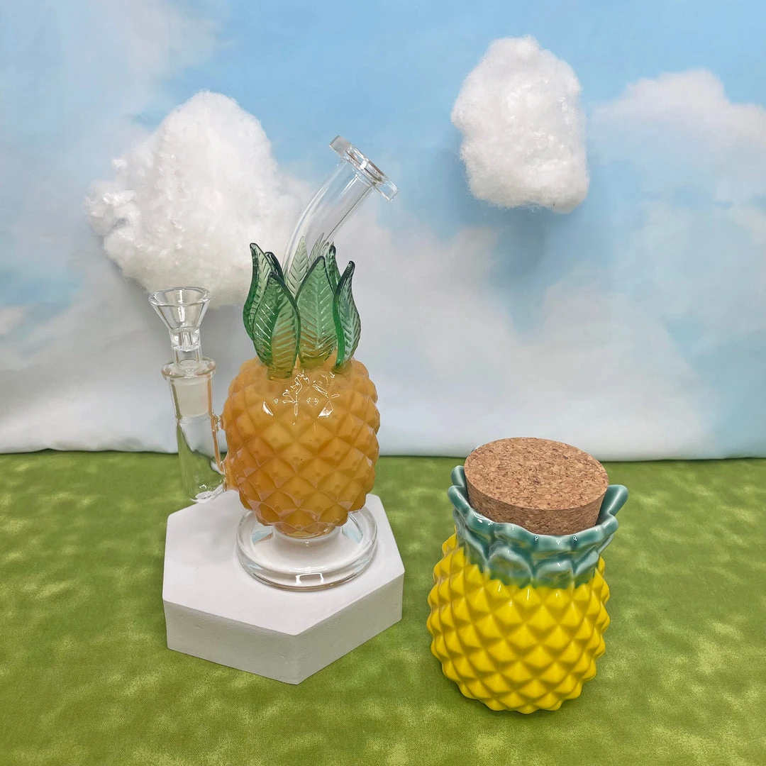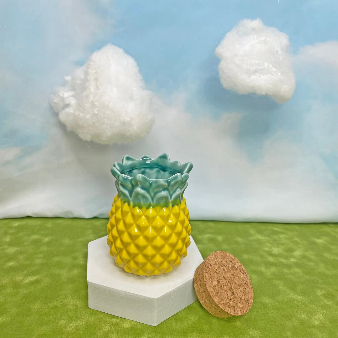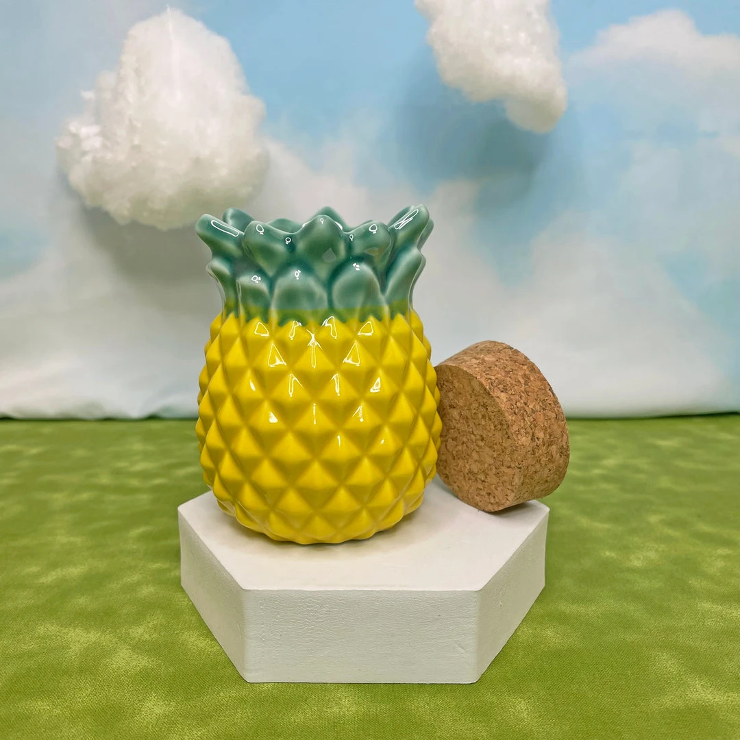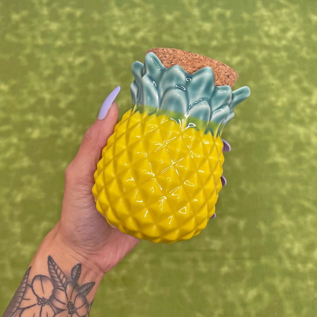This fully functional stash jar is made of ceramic and measures 3″ x 3″ x 4″. Shaped like a pineapple!