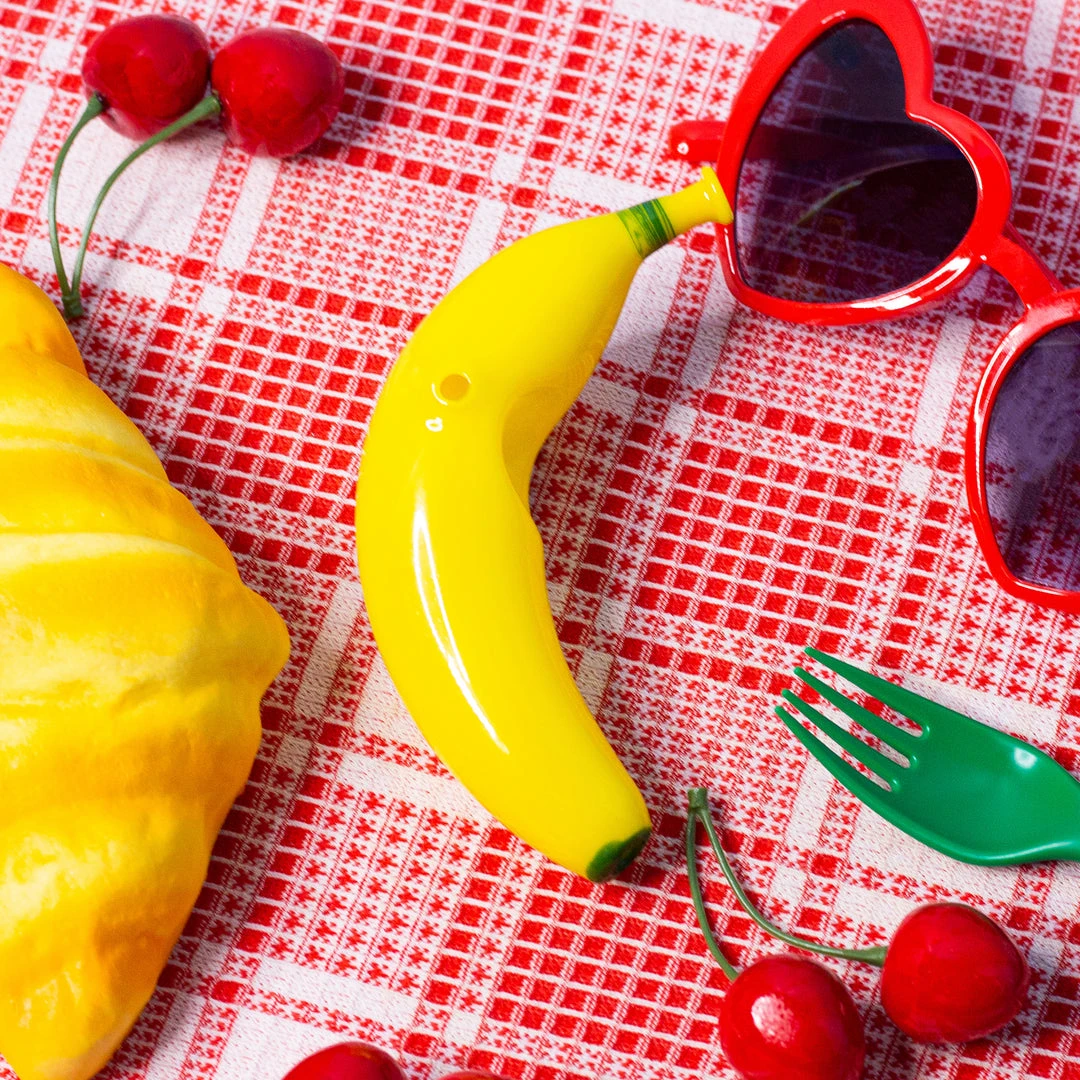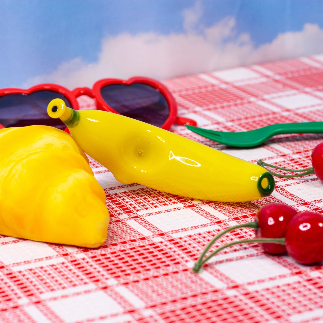 Pipe features a bowl on the end of the banana and a mouthpiece at the end of the banana. One carb is located on the left side of the banana.