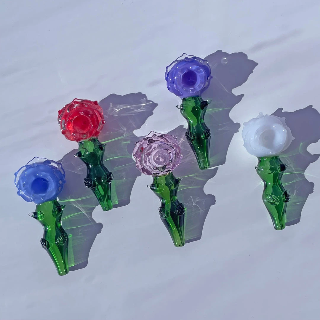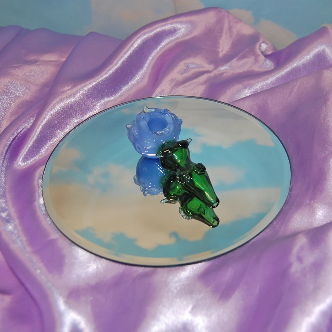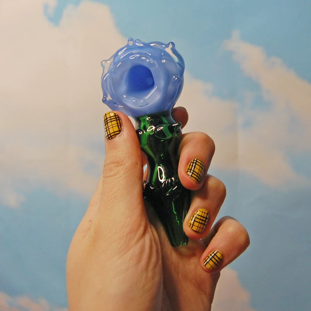 Carb is located on the left side of the bowl. Made of borosilicate glass. Measures 4.25 inches tall x 2 inches wide x 1.5″ tall. Features petals flanking the bowl and a cute fluted stem with lil harmless thorns and leaves.