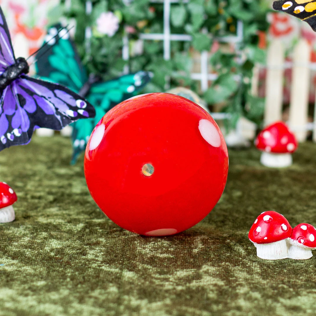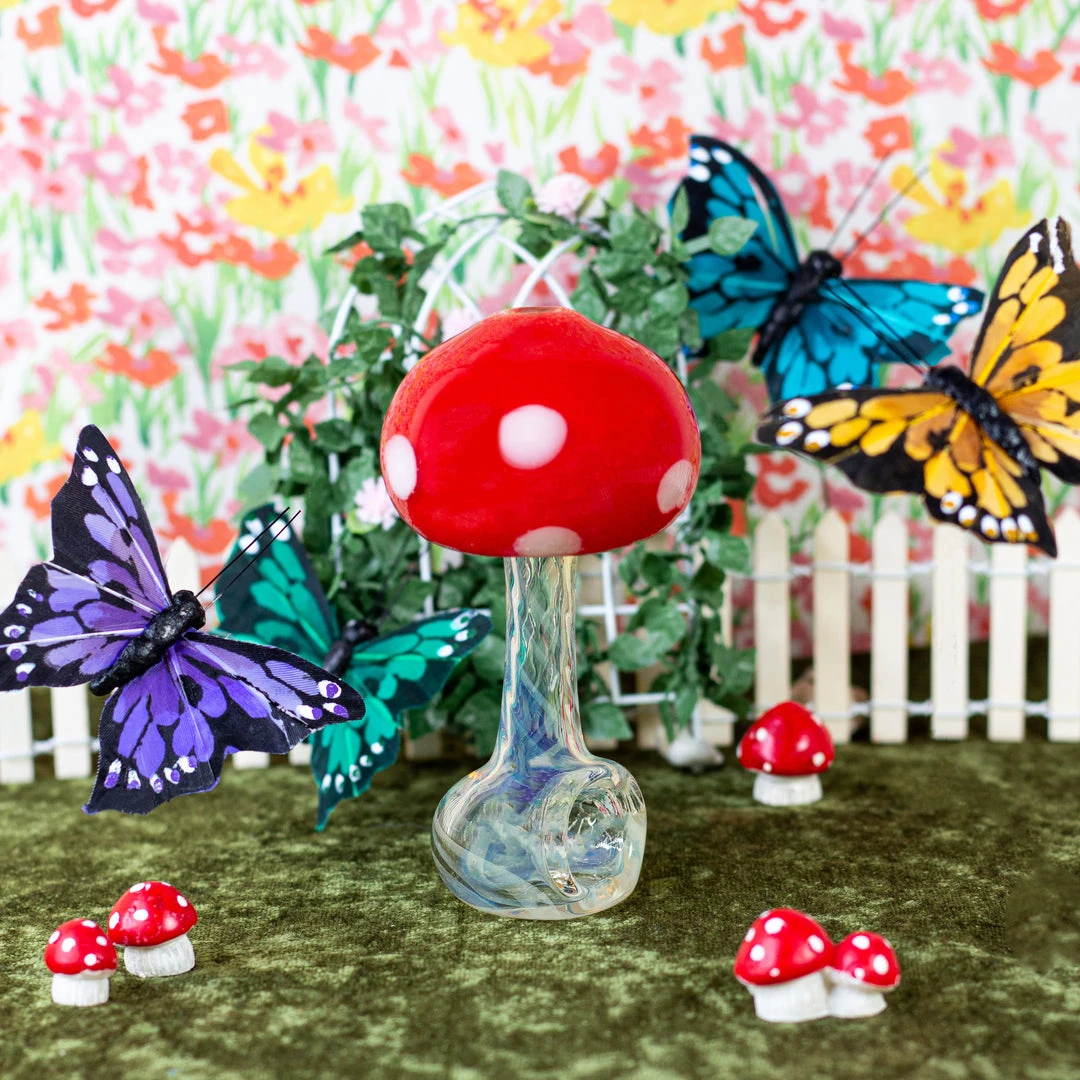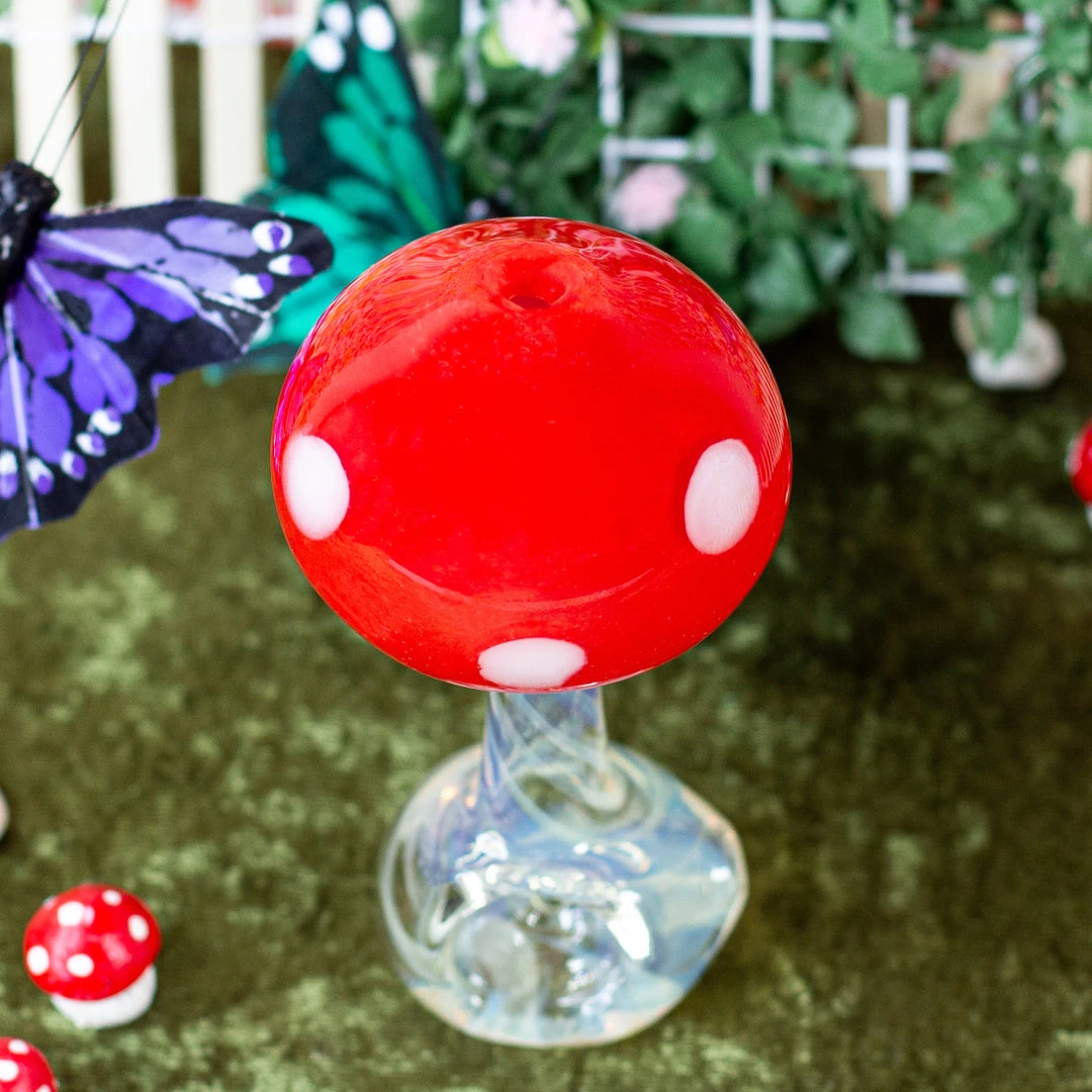 This pipe can stand on its mushroom stump or can lay horizontal on the ground. The detail on this piece is incredible- the top of the toadstool is perfectly plump and has cute lil white dots all around the top. The stem and bowl is made of clear glass with gorgeous gold fuming. The mouthpiece is at the top of the toadstool and the carb is on the side of the bowl.