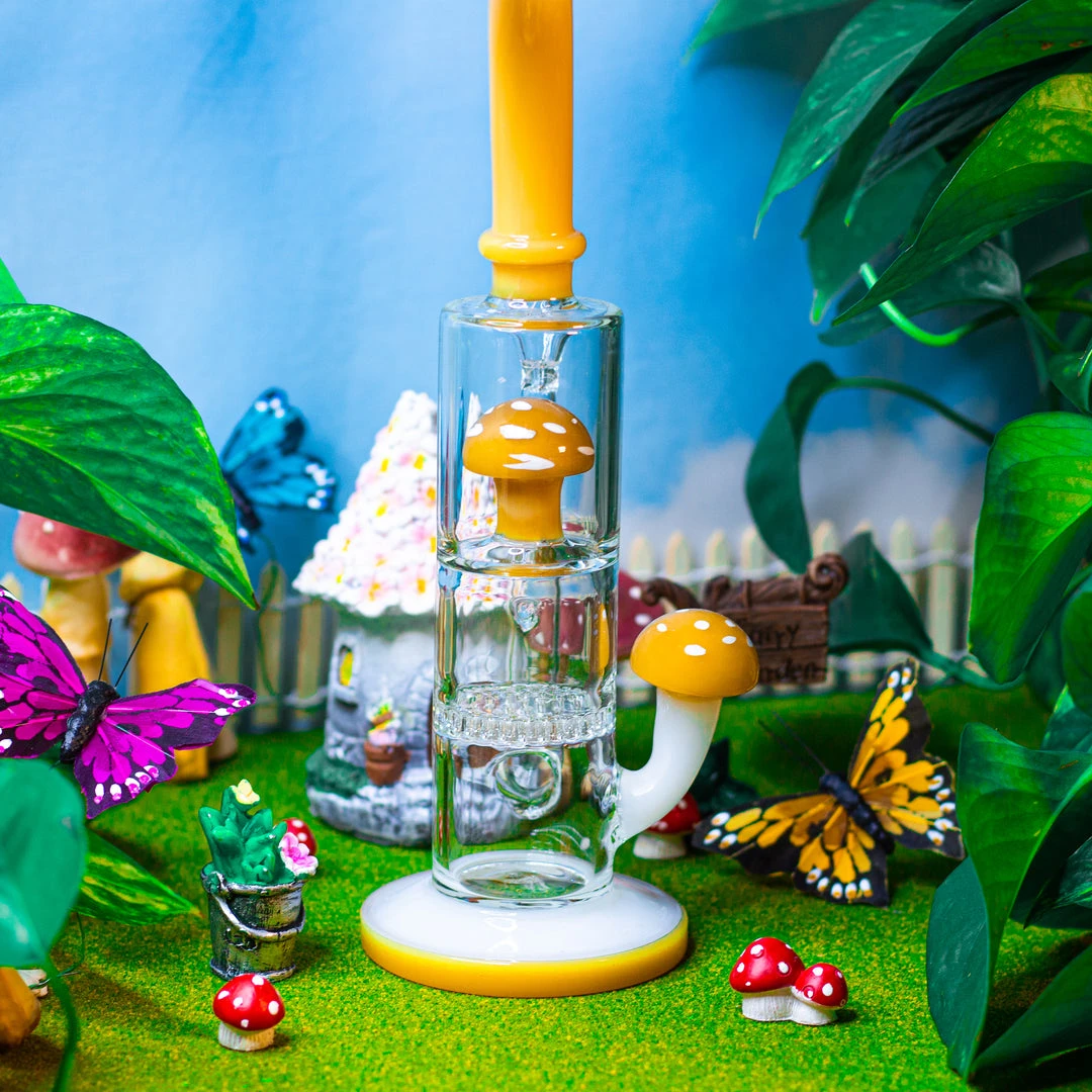 This 10.5″ beauty features a cylindrical smoke chamber and comes with not one but 2 percolators! a cute yellow mushie on top and honeycomb perc underneath! she even has an ash catcher, a curved neck, and a detailed mushroom on the side that not only looks cute but also functions as a handle. A sturdy base grounds this unique piece.
