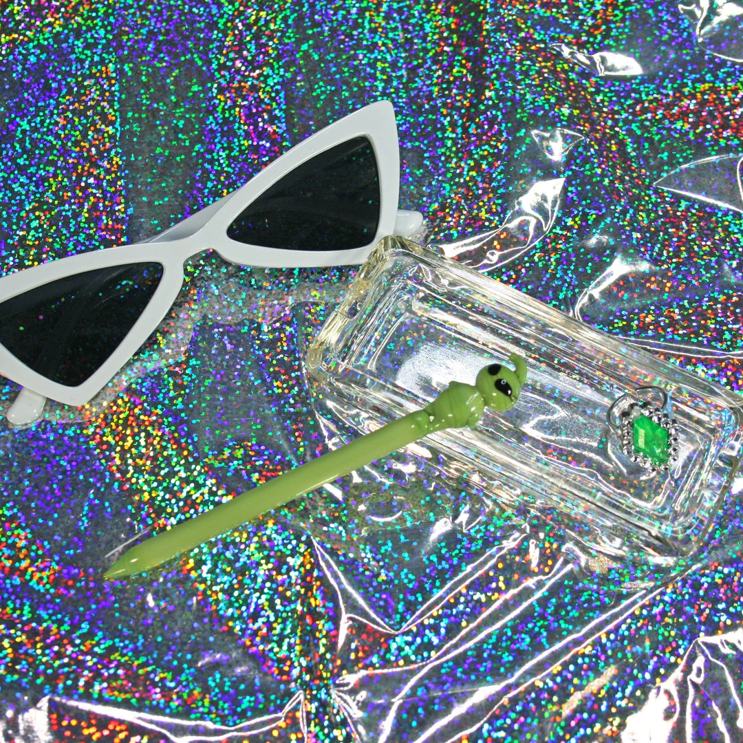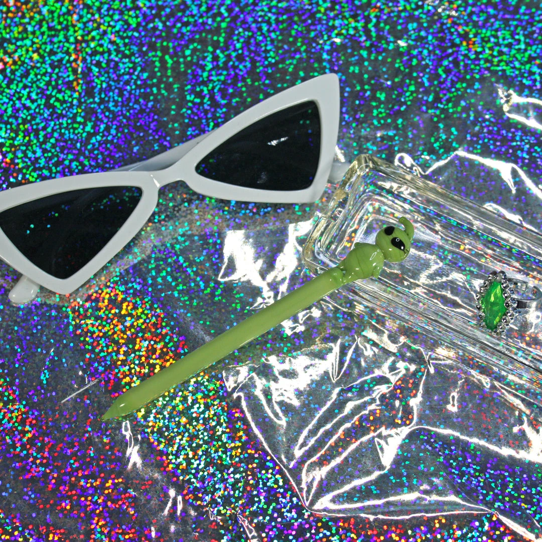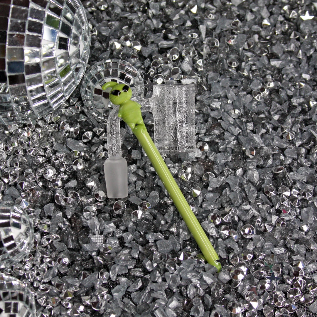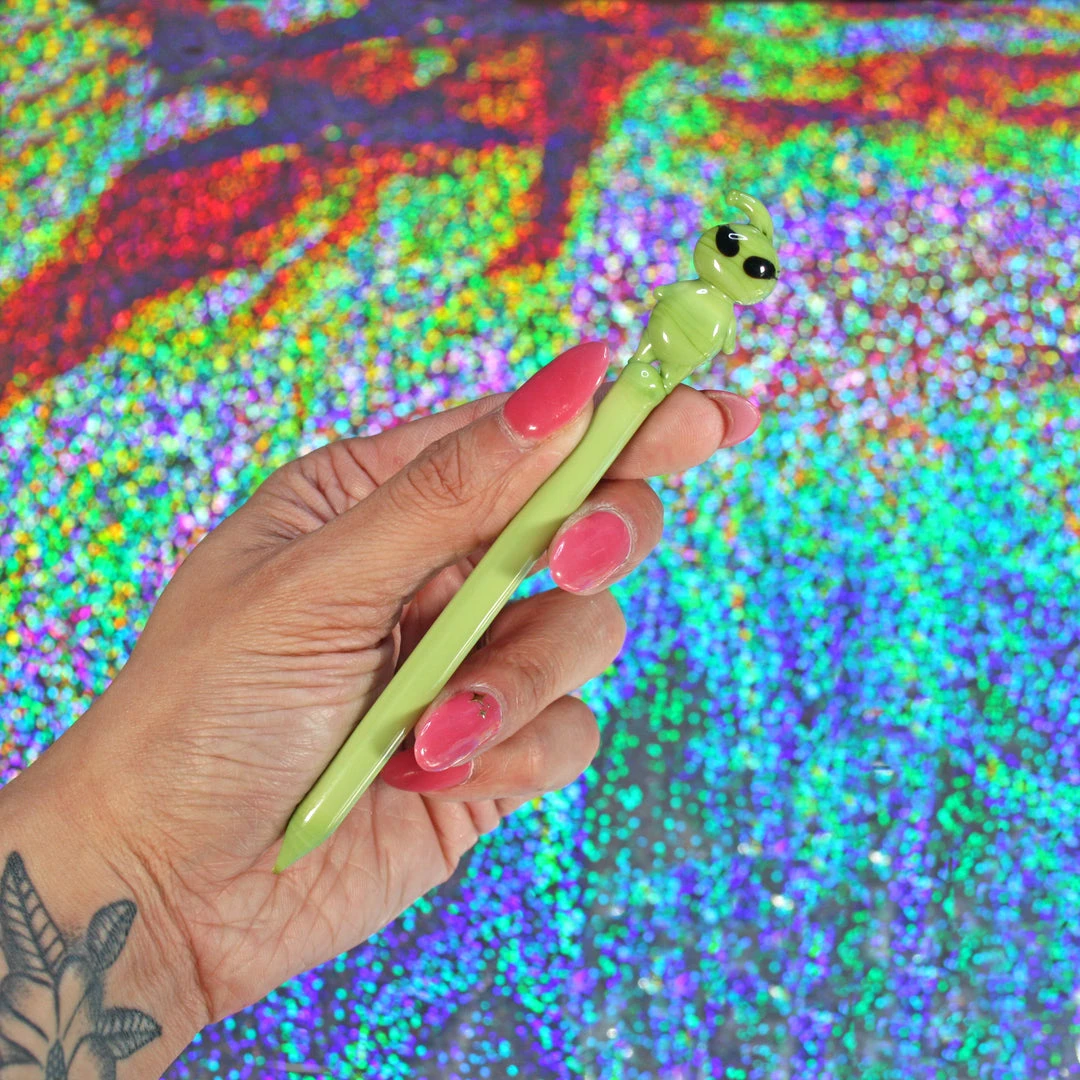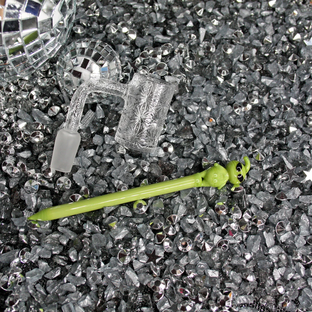 Dab tool measures 5″ and is made of green borosilicate glass. The cutest lil Alien sits on top!