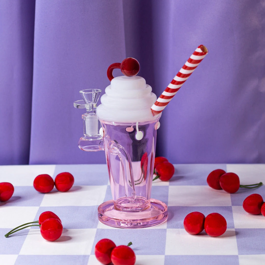 The Cherry Shake Bong. Shaped like a milk shake straight out of your fave diner, this bong is everything of the sort. Mouthpiece is the detailed super cute straw made of swirled red and white glass. Comes with an ash catcher and a 14mm quartz slide.