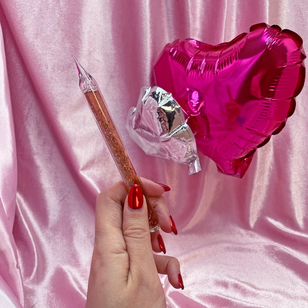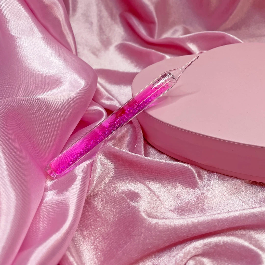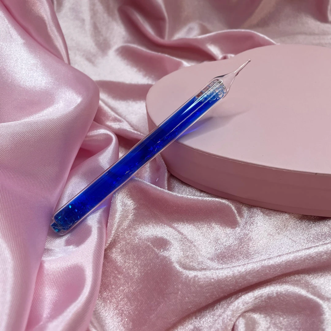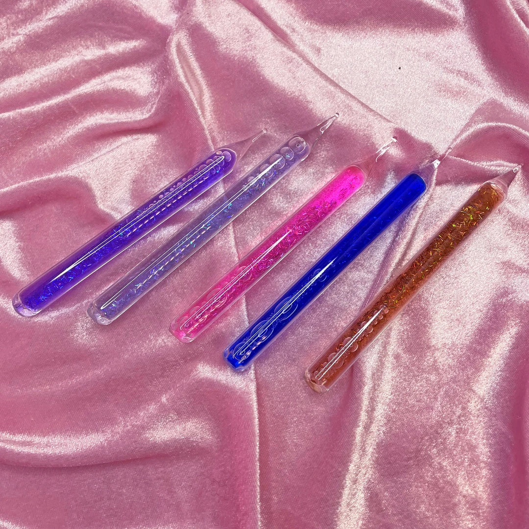 This dab tool is made of glass and filled with glitter in a colored liquid.