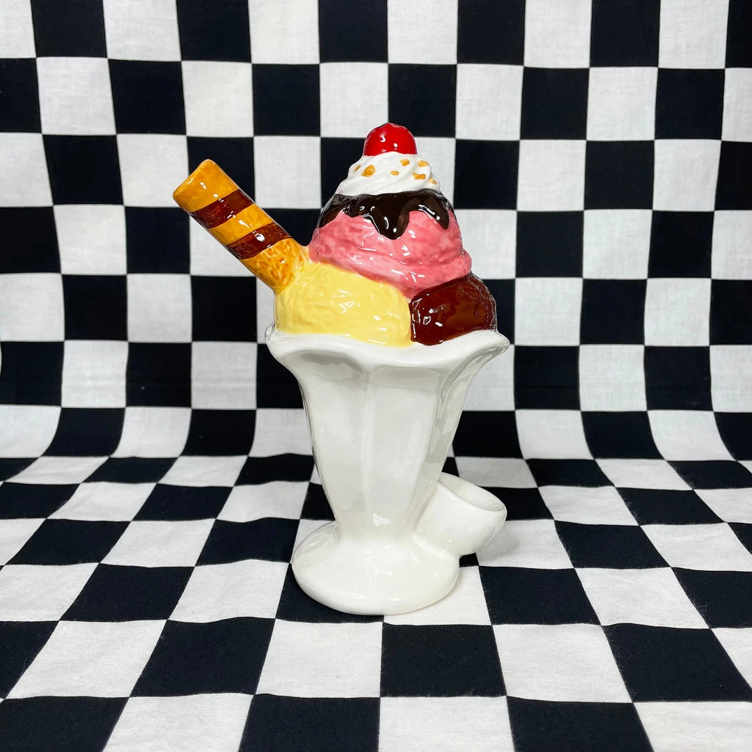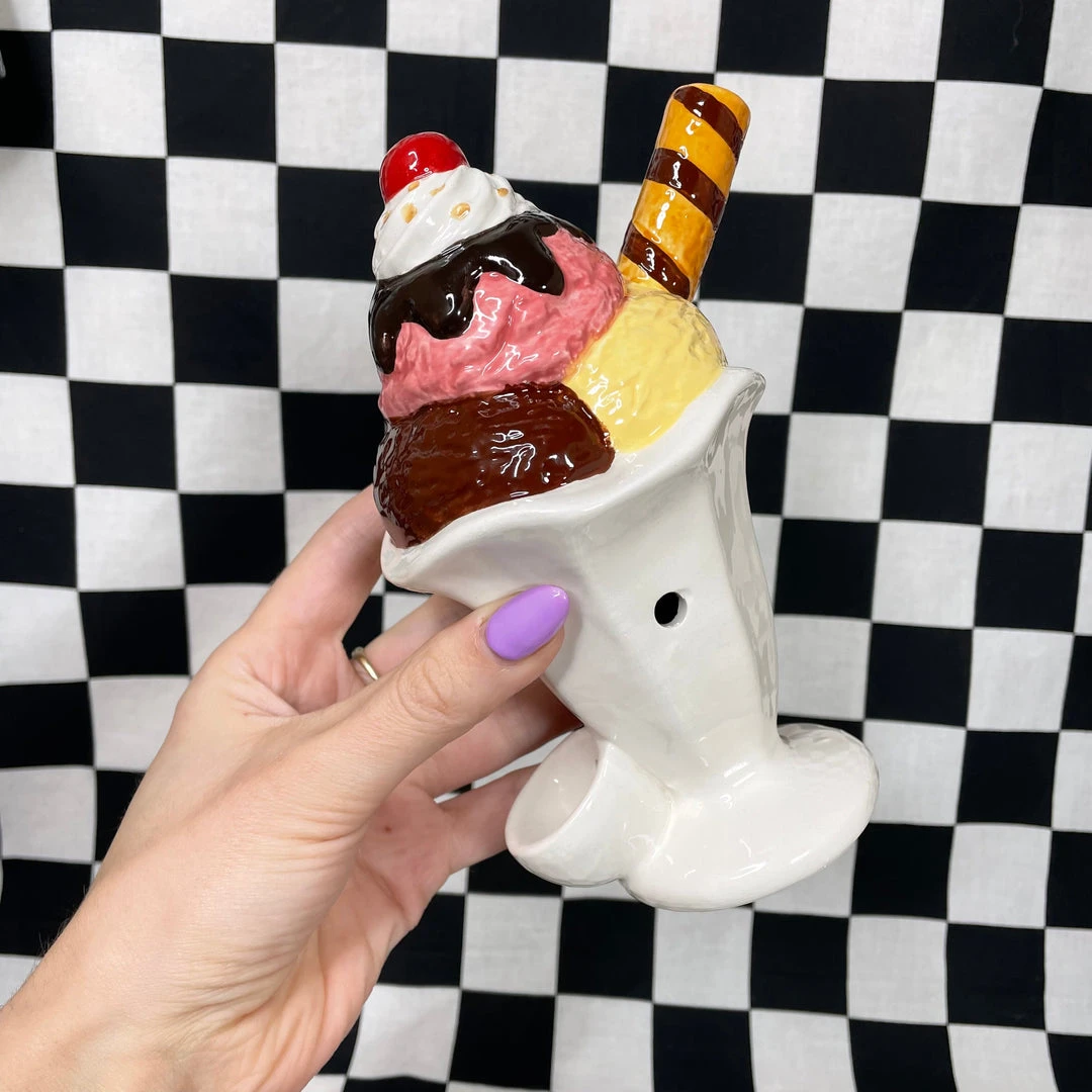 This piece is made of ceramic and looks exactly like an ice cream sundae. The wafer on top is the mouthpiece and there is a bowl with a carb on the bottom of the sundae dish.