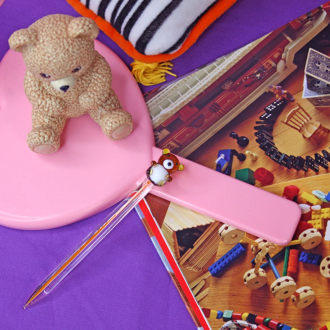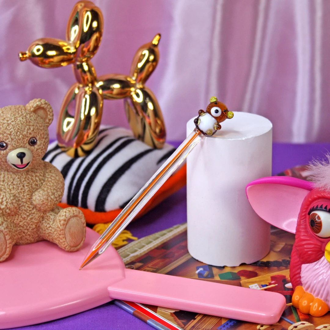 Dab tool measures 5″ and is made of clear borosilicate glass. The cutest lil teddy sits on top and is made of amber, white and black glass.
